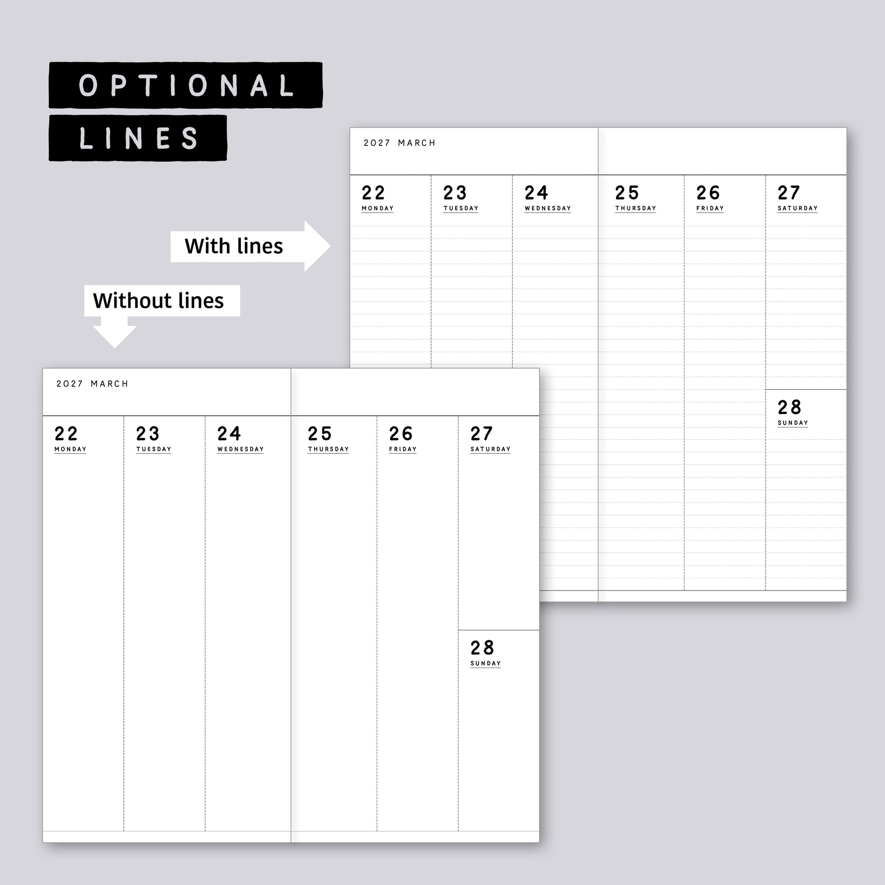 Vertical dated weekly calendar in regular/standard size (110x210 mm or 4.3 × 8.25 inches).