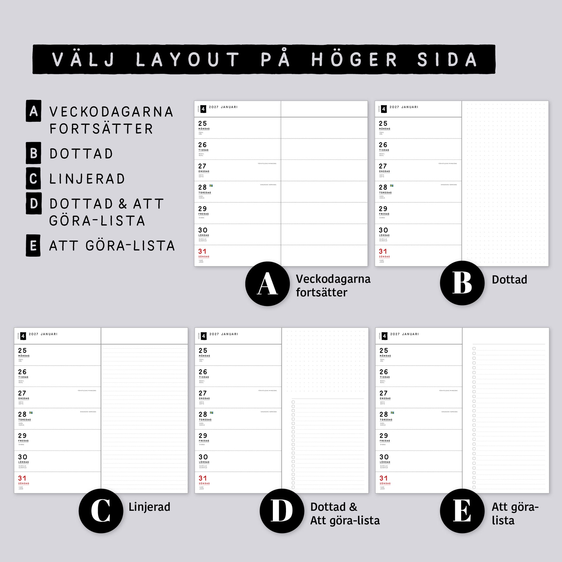Med eller utan årskalendrar på omslagens insidor. Samma år som kalenderns år på framsidans insida och efterföljande år på baksidans insida. Ej möjligt med svart omslag.