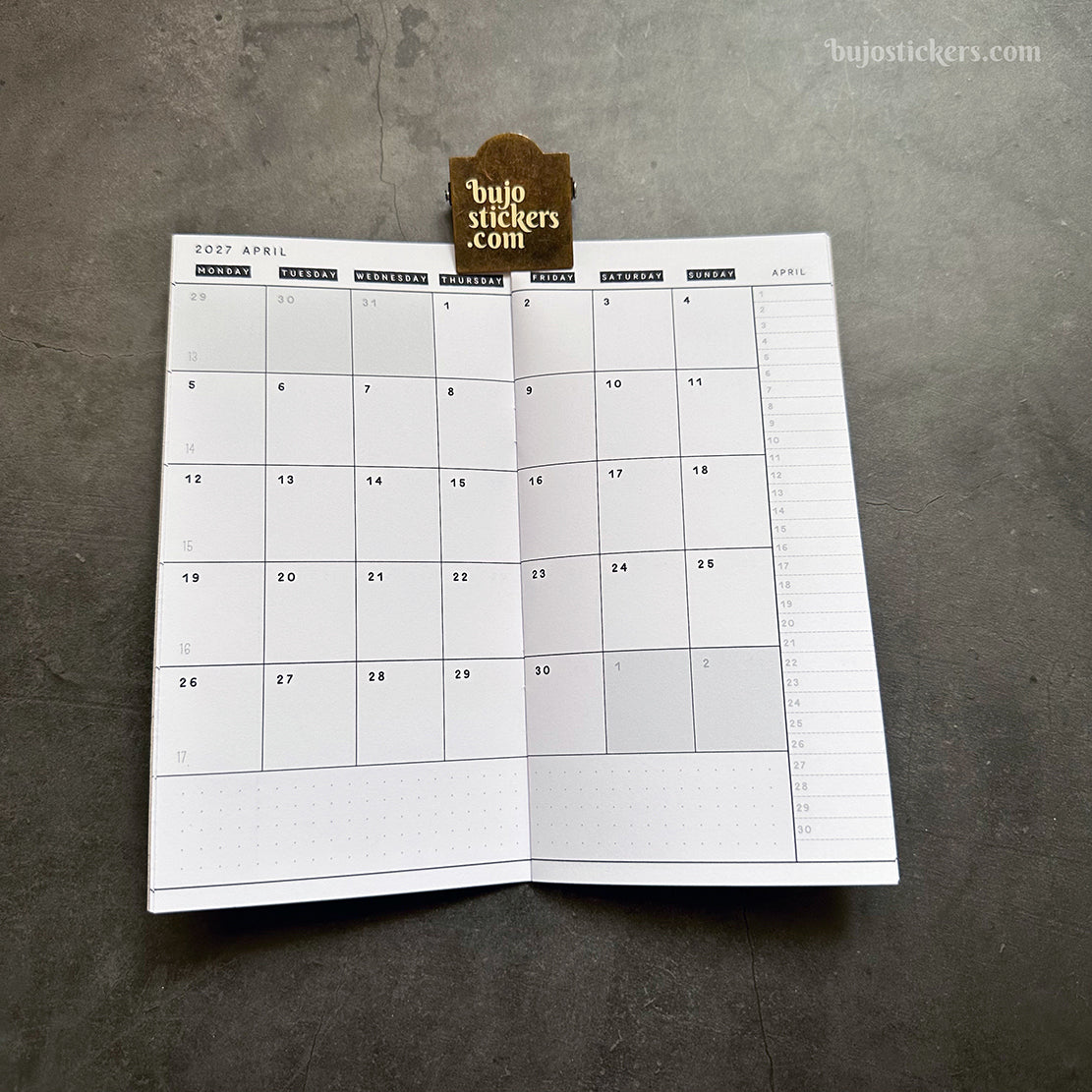 One month per spread. Squares with dates for each day plus a vertical column with light grey dates for notes or planning. One extra spread for notes.