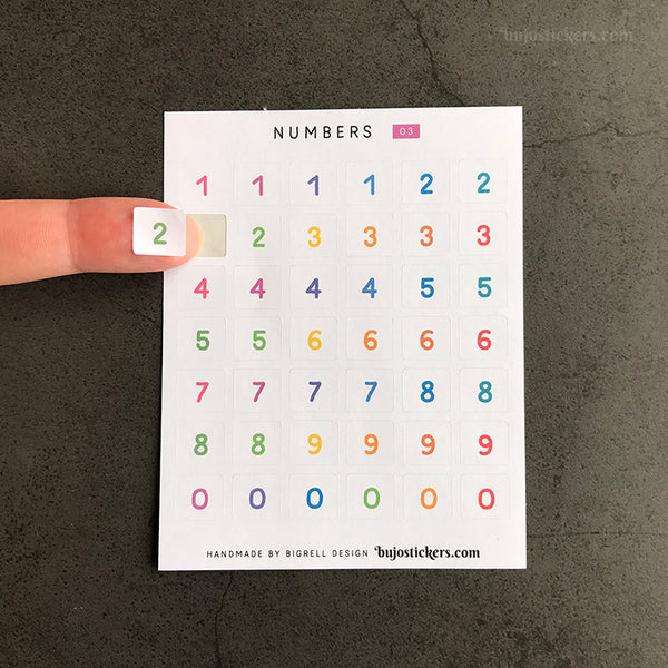 Stickers with numbers 0-9. Numbers in different colours on white paper.