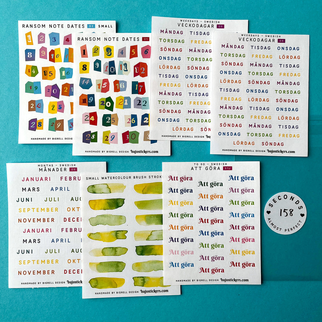 This set of stickers are seconds. That means they have som defects. It can be slightly off colours, smudges, print not being perfect, or the cutlines being off, or it is simply discontinued items or an older version of current stickers. All of them are usable, and we sell them at a great price! Everything you get in this bag you can see in the picture (note that colours may vary from each screen), and you will receive these exact items.