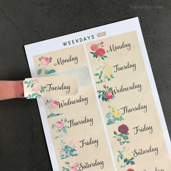 Days of the week, two weeks worth. Vintage style with old paper and vintage flower illustrations. Black text in script font.