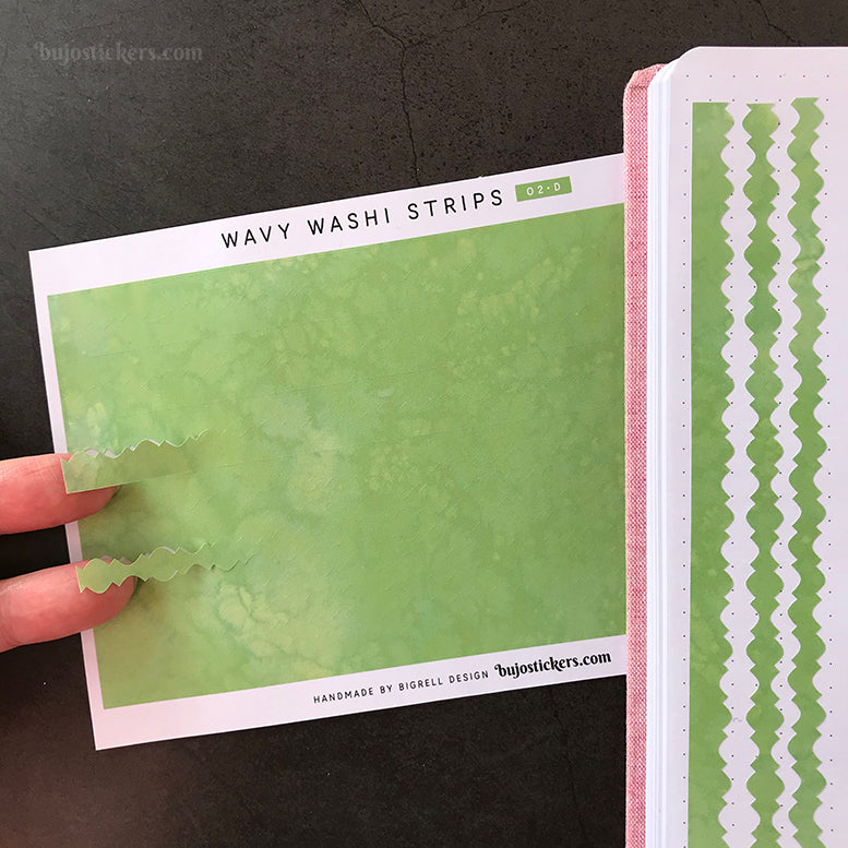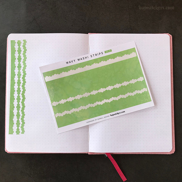 Wavy strips stickers. Green strips with wavy edges. 15 sticker strips with varied waves.