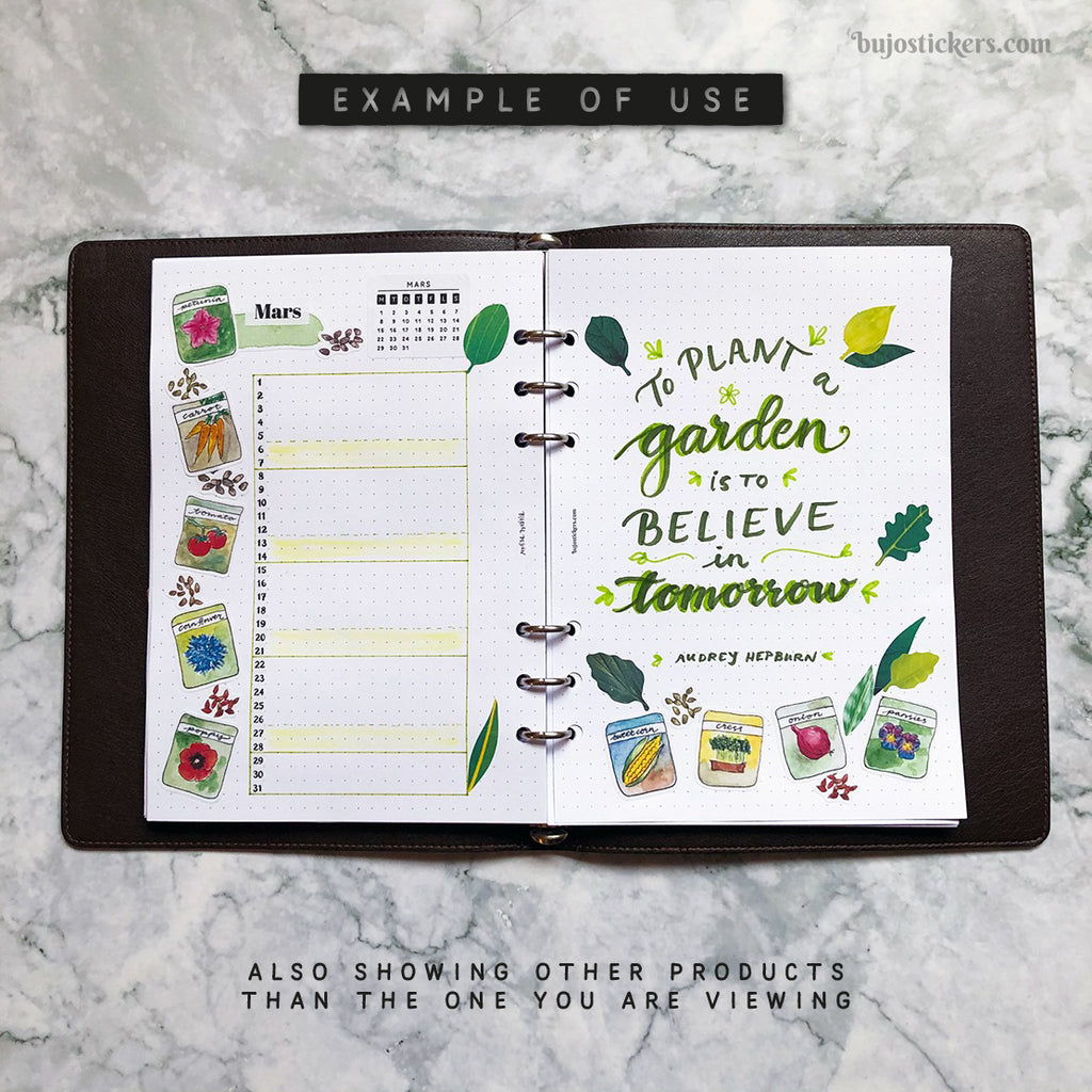 These stickers are handmade on thin matte sticker paper. Though not water proof, they can take a light layer of watercolour or similar. You can write on and stamp the stickers. Please allow for tiny imperfections and note that colours may vary from each screen.