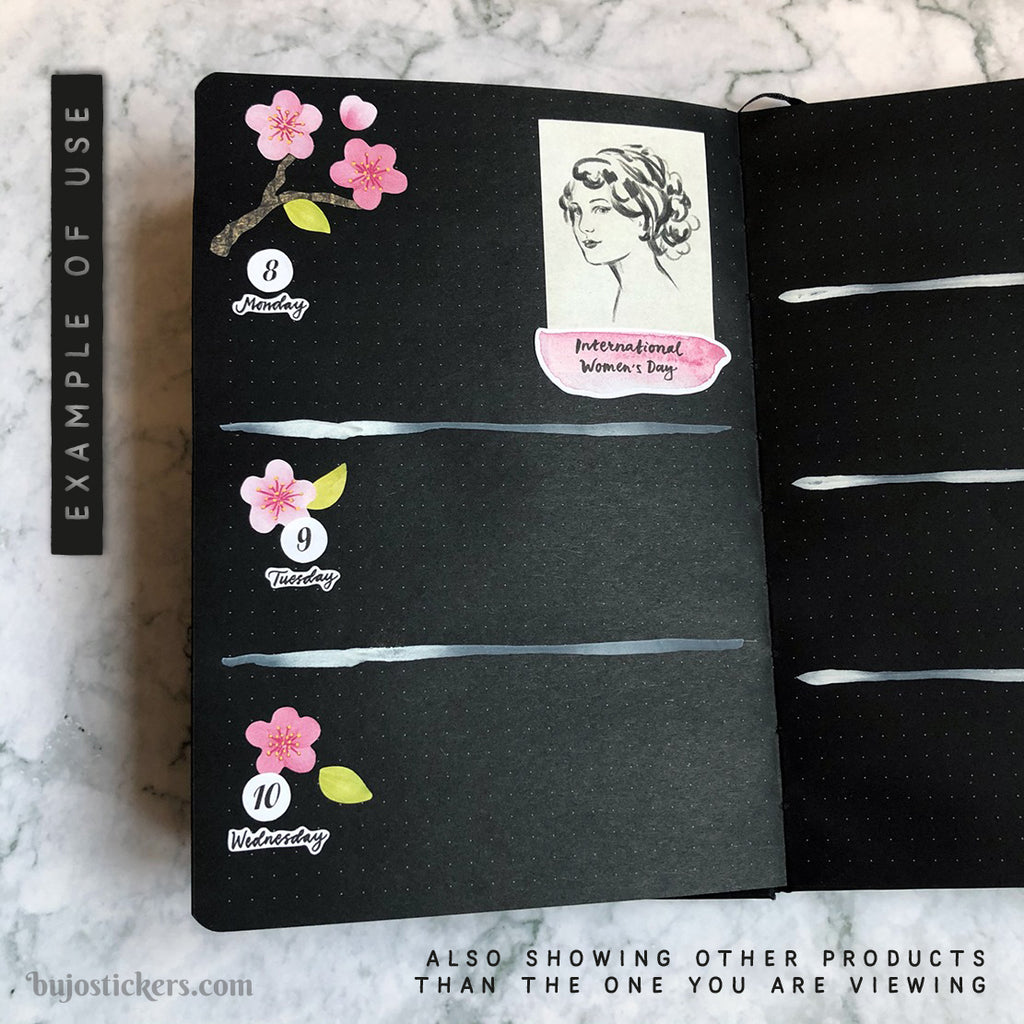 These stickers are handmade on thin matte sticker paper. Though not water proof, they can take a light layer of watercolour or similar. You can write on and stamp the stickers. Please allow for tiny imperfections and note that colours may vary from each screen.