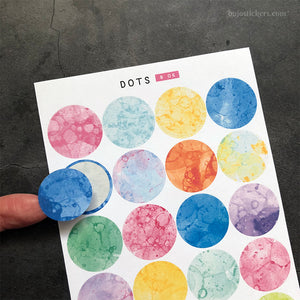 Colourful watercolour bubble textures on this set of 1 inch circles/dots. 20 full cover stickers (no white edges) on one sheet of matte sticker paper.