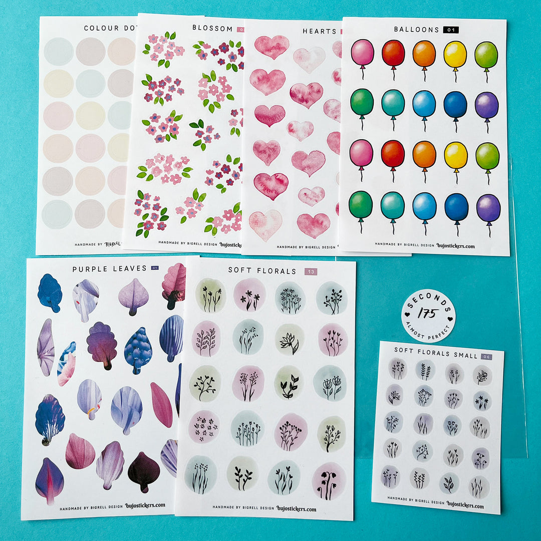 This set of stickers are seconds. That means they have som defects. It can be slightly off colours, smudges, print not being perfect, or the cutlines being off, or it is simply discontinued items or an older version of current stickers. All of them are usable, and we sell them at a great price! Everything you get in this bag you can see in the picture (note that colours may vary from each screen), and you will receive these exact items.
